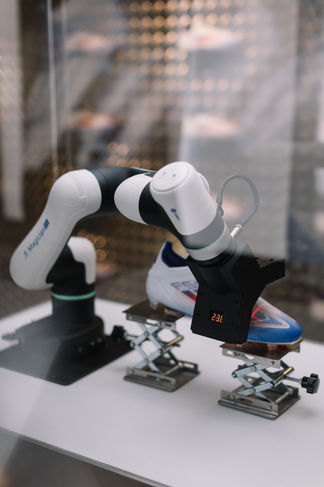 During the 2024, F50 showcase in the same store, the IAN the robot made a second appearance in which the creative wanted to replicate an Xray/ Scanning scene. I therefore designed a custom end to the arm that could mimic and scanner, by taking apart a 3.3v Laser spirit level and custom 3d printing a housing with twinned seven segment display on each back face. Once assembled the robotic arm was animated around the shoe holder, where the laser line would look as tho it was scanning the shoe.